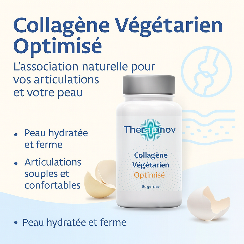 Au sein de la gamme Therapinov, le laboratoire Very Natura a développé Collagène Végétarien Optimisé : Peau & Articulations, une formule originale à base d’extrait de membrane d’œuf ESM®, naturellement riche en collagène, chondroïtine, glucosamine, acide hyaluronique et lysozyme. Cet extrait est complété par de la vitamine C et du silicium d’origine végétale (bambou), dans une gélule 100 % végétale (pullulan).
