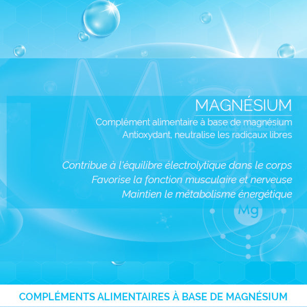 Le magnésium est un cofacteur de plus de 300 réactions enzymatiques. Il contribue à un métabolisme énergétique normal*, au fonctionnement normal du système nerveux* et à une fonction musculaire normale*, contribue à l’équilibre électrolytique* ainsi qu’au maintien d’une ossature et d’une dentition normales*. L’association de deux sels organiques, malate de magnésium et acétyl-taurinate de magnésium, vise un apport quotidien régulier en magnésium élément, bien toléré au repas.