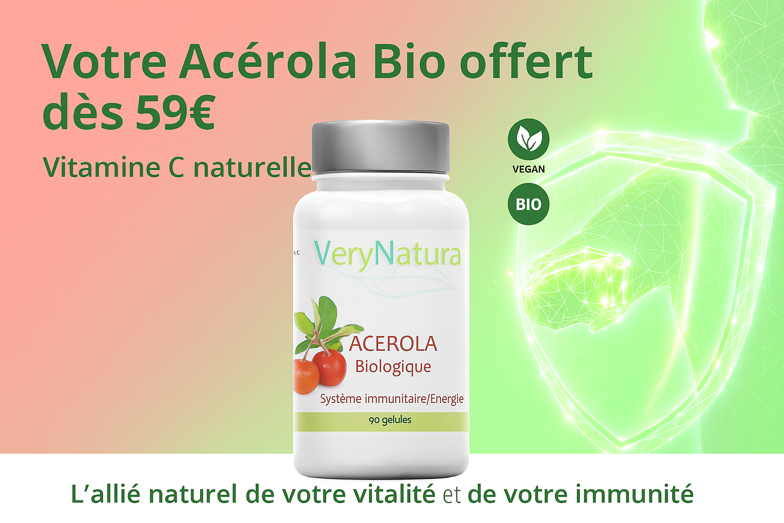 - Ingrédients : Acérola bio (titrée à 17 % de vitamine C), farine de riz bio, gélule végétale.